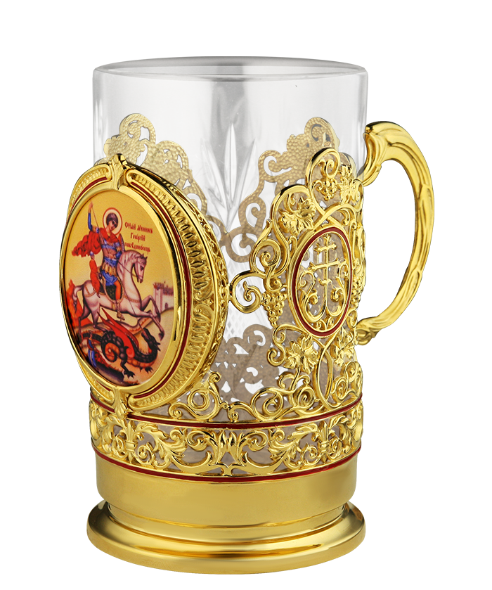 Подстаканник латунный в позолоте с иконой святого Георгия Победоносца.
